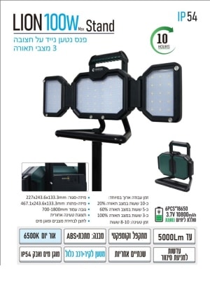 זרקור לד (הצפה) נטען לד 3 מצבים אור+עמוד OMEGA LION- 100W IP54